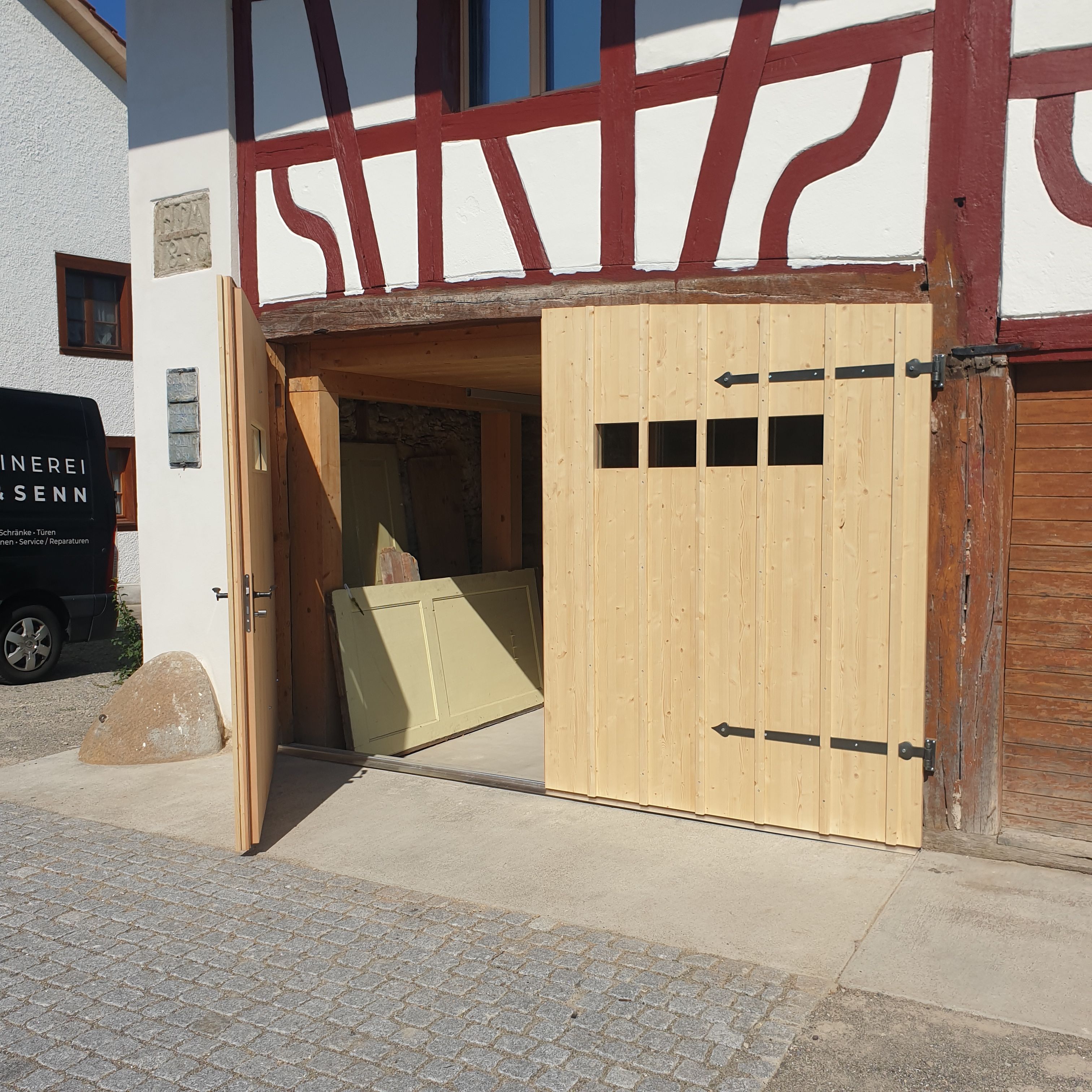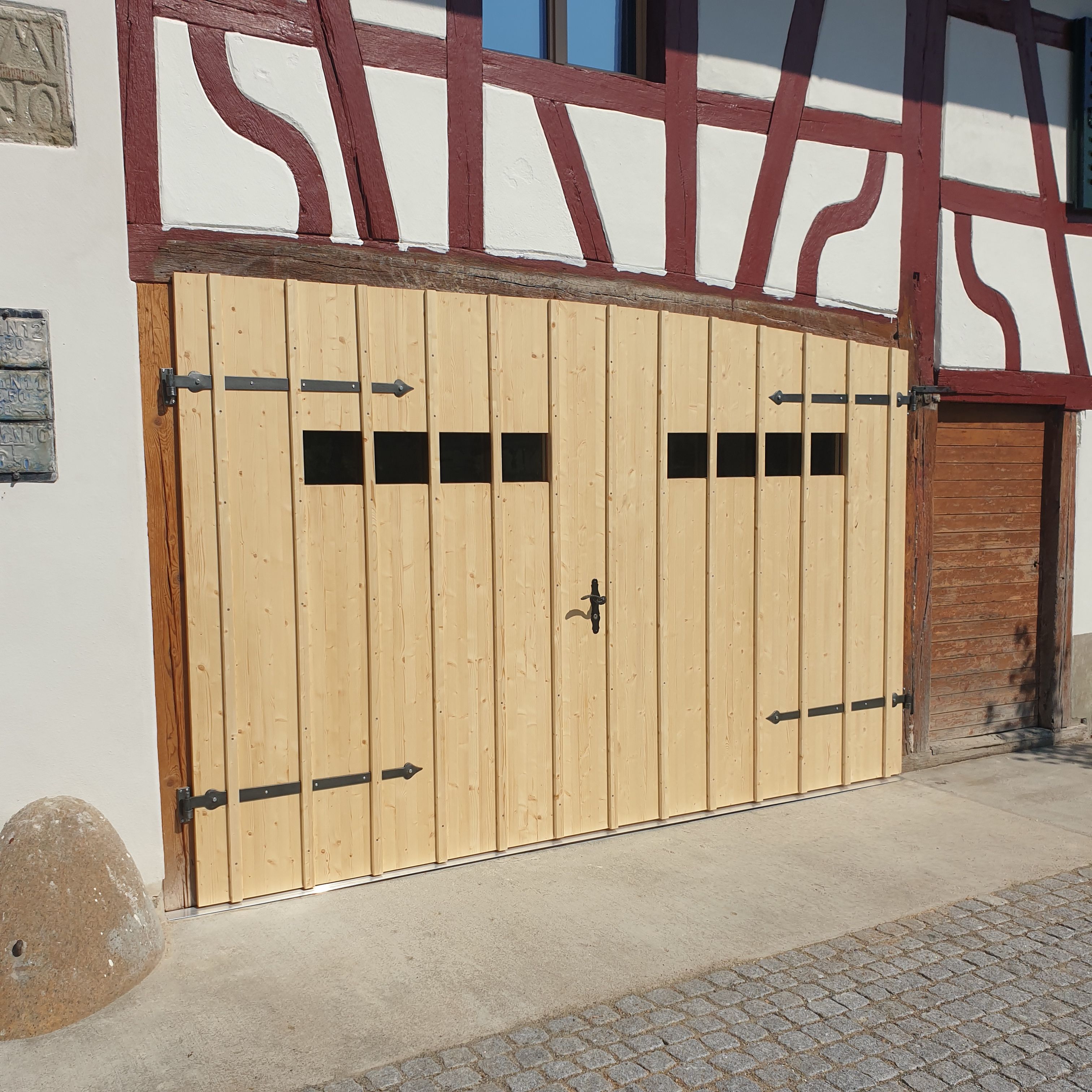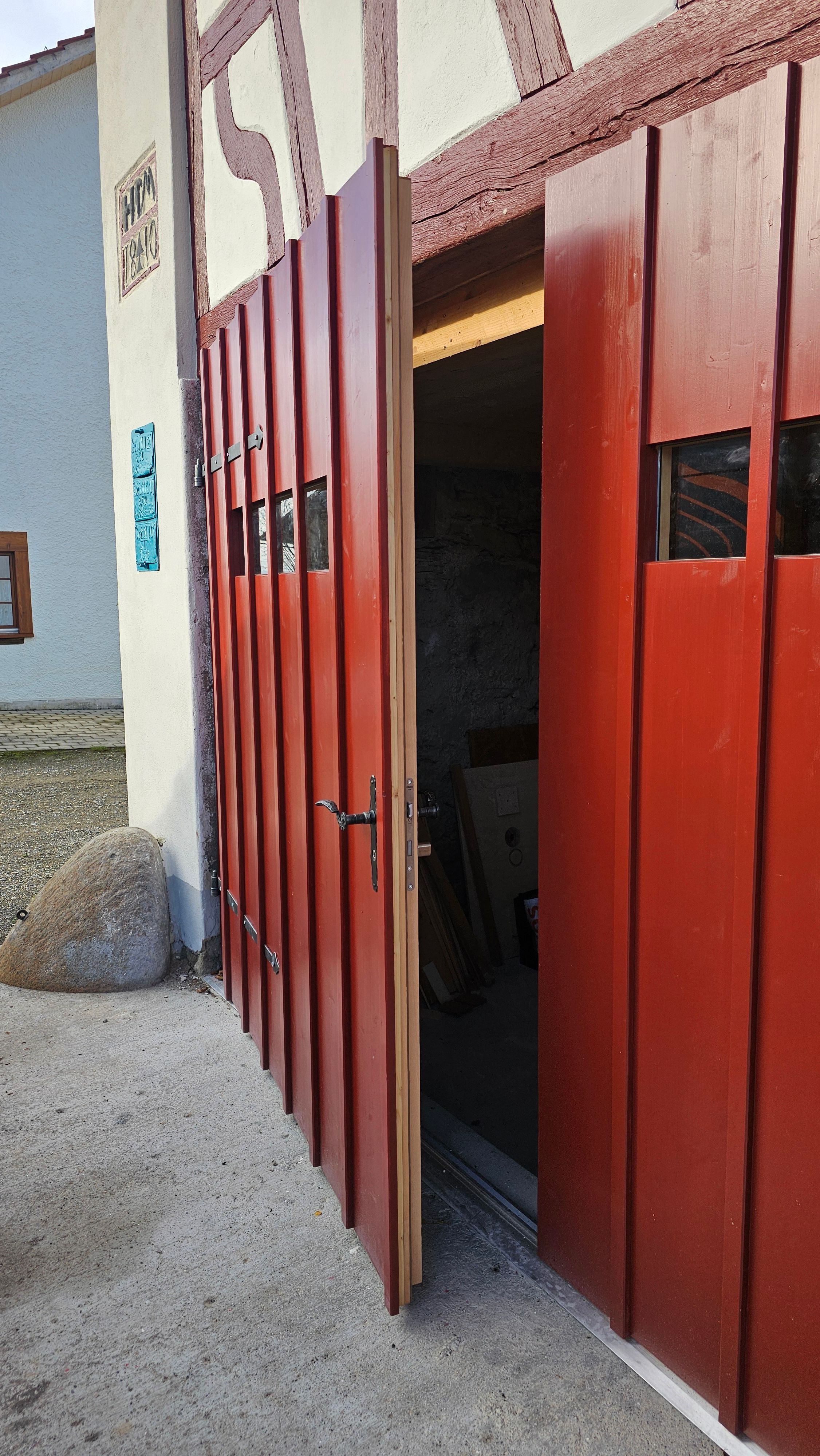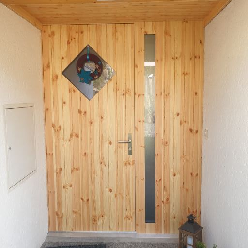 Die Haustüre stammt aus den 1950er Jahren und wies erhebliche Schäden durch Holzschädlinge auf. An zahlreichen Stellen war das Holz stark befallen, sodass Wind ungehindert durchziehen konnte und auch Feuchtigkeit ins Innere eindrang.